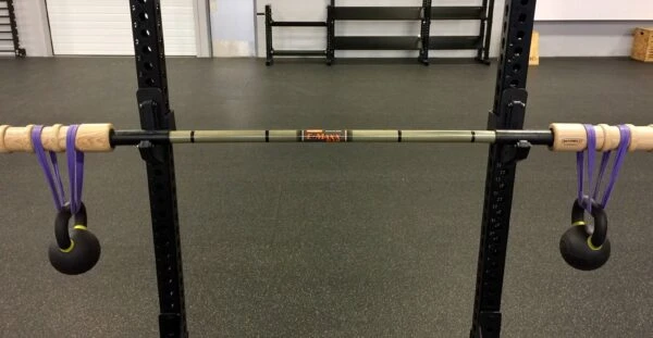 The E-Maxx Bar can be custom-setup in a multitude of ways with both bands and weights. Two-inch grooves cut into the wood are designed to channel and grip the bands even as the bar bends radically under super-heavy weight. High-tech polymer bumpers have been added to each end of the bar to protect it when racking and to provide better control.