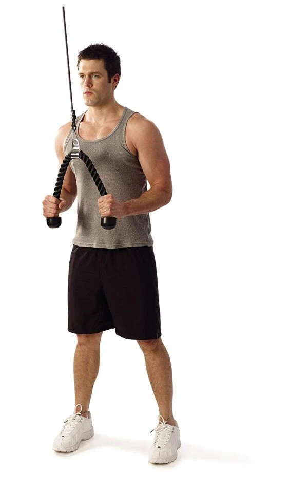 To get a more intense workout for your triceps, try the Valeo Tricep Rope. The tricep rope helps you to develop your triceps, biceps, back, shoulders, and abs. It also improves your grip strength. The Valeo tricep rope is 28-inches and is made of heavy-duty coated nylon rope with solid rubber ends. The heavy-duty chrome-plated attachment connects to any universal gym system.